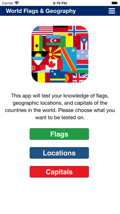 The World Flags and Geography App is both a game and a learning tool. This app will test your knowledge of flags, geographic locations, and capitals of the countries in the world.